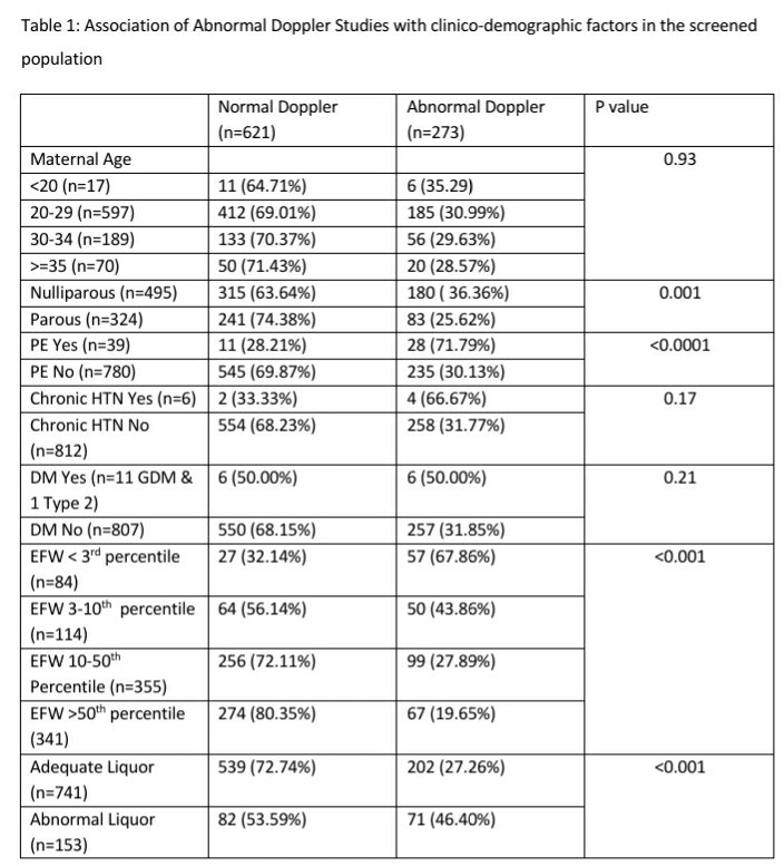 Abnormal CPR and mean uterine artery PI were the most common abnormal Doppler study (see Table 2) in the screened population (n=895)