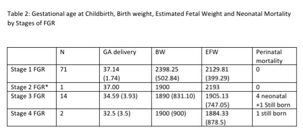Fetal Growth was categorized as Stages 1 -4, no fetal growth restriction (FGR) or small for gestational age (SGA) and managed based on the protocol described by Figueras at al. [5] A SGA fetus was defined as a fetus with EFW 3-10th percentile and a normal Doppler study.[5] Childbirth outcomes of interest included preterm births, birthweight, neonatal mortality and still births.