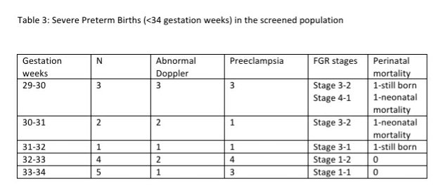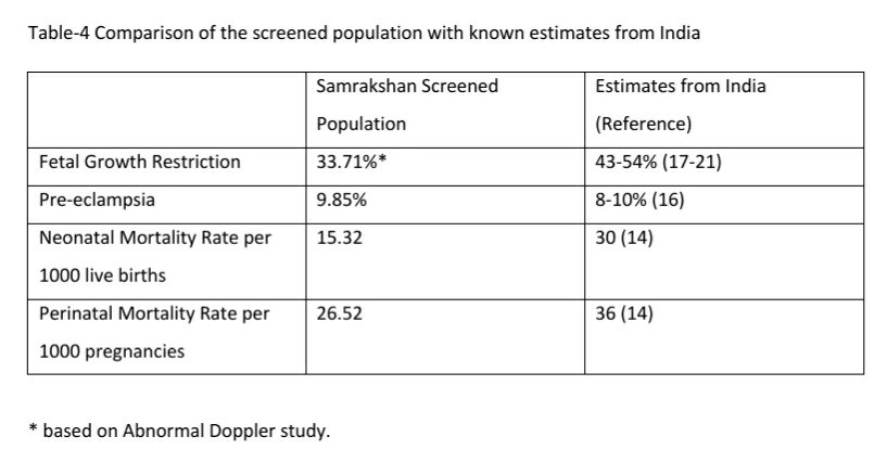 Methods: Details of child birth of women screened in the Samrakshan program were stored in an online database without individual patient identifiers. The incidence of abnormal Doppler studies, Pre eclampsia and fetal growth restriction, gestational age at delivery, estimated fetal weight and birth weights, neonatal mortality and still births were collected.